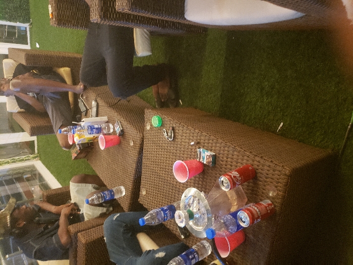 The scene depicts an indoor or semi-outdoor lounge area in Asaba, Nigeria, characterized by dark green artificial turf flooring. Four individuals are present, seated in brown wicker-style armchairs with light-colored cushions. In the foreground and mid-ground, two matching brown wicker-style rectangular coffee tables hold various items. On the foreground table, a small glass hookah with a silver top and green plastic component is centrally placed. Surrounding it are multiple red plastic cups, two red Coca-Cola cans, and a plastic bottle of water. A small green circular container and a silver metallic object, possibly a lighter, are also on this table. A rectangular package, possibly containing cigarettes, is also visible. The mid-ground table contains additional items: multiple plastic bottles of Aquafina water, a red plastic cup, a small clear plastic bag, a yellow wrapper, and a smartphone. Regarding the individuals: 1. On the far left, an adult male with dark skin wears a dark short-sleeved collared shirt, light-colored shorts, and a camouflage baseball cap. He has earrings and a necklace, and is seated facing right. 2. In the center-right, an adult male with dark skin, wearing a dark t-shirt and dark shorts, is seated barefoot with his legs crossed at the ankles and hands near his face. 3. In the lower left, only the lower torso and legs of an individual wearing blue jeans are visible, seated in an armchair. 4. In the lower right, only the legs and feet of an individual wearing dark trousers and dark sandals are visible, seated in an armchair. The background shows large glass panels or windows, indicating an enclosed or semi-enclosed space, with indistinct white structures visible beyond. The lighting is consistent with an indoor or evening setting. The overall arrangement suggests a casual social gathering.