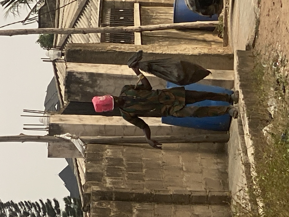A person dressed in camouflage clothing and a red covering on their head stands next to a building. They are holding a large black bag over their shoulder. Blue barrels are visible behind the person and next to the building. The building is constructed of concrete blocks, and there is another building with a corrugated metal roof in the background. Vegetation is seen on the right side of the image.