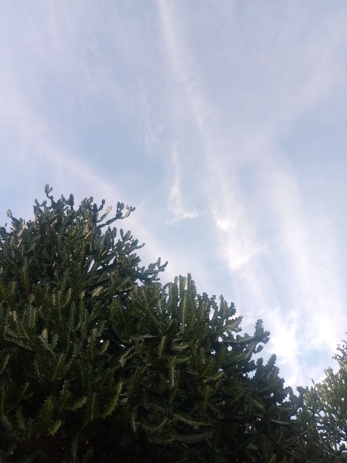 A low-angle shot captures a large cactus against a bright sky with wispy clouds. The cactus, a deep green color, fills the lower portion of the frame, its spiky branches reaching upwards. The sky, a pale blue, contrasts with the dark foliage. The clouds create a soft, diffused light, highlighting the texture of the cactus.