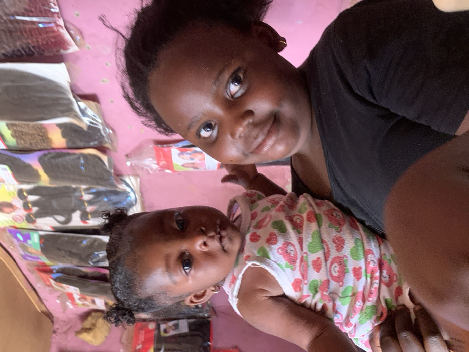 Two dark-skinned individuals are depicted indoors in Garaku, Nigeria. An older female, appearing to be a young adult or teenager, is positioned on the right, looking directly at the camera with a slight smile. She has dark hair and wears a black short-sleeved top and small gold hoop earrings. She is holding an infant on her left side. The infant, with dark hair styled into two small pigtails, is positioned on the left, looking directly at the camera with a neutral expression. The infant wears a white sleeveless onesie patterned with pink teddy bears and green hearts, and also has small gold hoop earrings. The background features a solid pink wall displaying multiple clear plastic packages of various hair extensions, including braids and weaves, indicating a commercial setting such as a shop or salon.