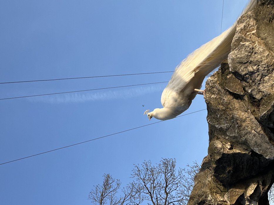 - "An albino or leucistic peacock stands on a rugged, moss-covered rock formation under a clear blue sky in Lukovit, Bulgaria" by FM-Pur1n2, licensed under CC BY 4.0