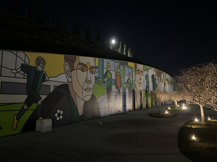 The image displays a night view within Krasnodar Park (Galitsky Park) in Krasnodar, Russia. A long, curving concrete retaining wall features a vibrant mural executed in a stylized, geometric art form resembling stained glass. The mural predominantly depicts figures associated with soccer, including a large-scale male figure in a dark jersey with a white soccer ball logo in the foreground, and a soccer player in a green and black striped uniform shown in a running posture to his left. Additional figures are depicted along the mural's length. A paved pathway runs parallel to the wall. To the right of this path, several small, bare-branched trees are planted in circular grass beds, illuminated by multiple ground-level spotlights. The ground is also lit by similar discreet lights. Above the retaining wall, a dark, sloped grassy area is visible, topped by a line of tall, slender trees silhouetted against a dark night sky. A visible moon is positioned in the upper center of the frame. A small, light-colored concrete block is situated at the base of the mural in the lower-left portion of the scene. No live individuals are present in the captured environment.