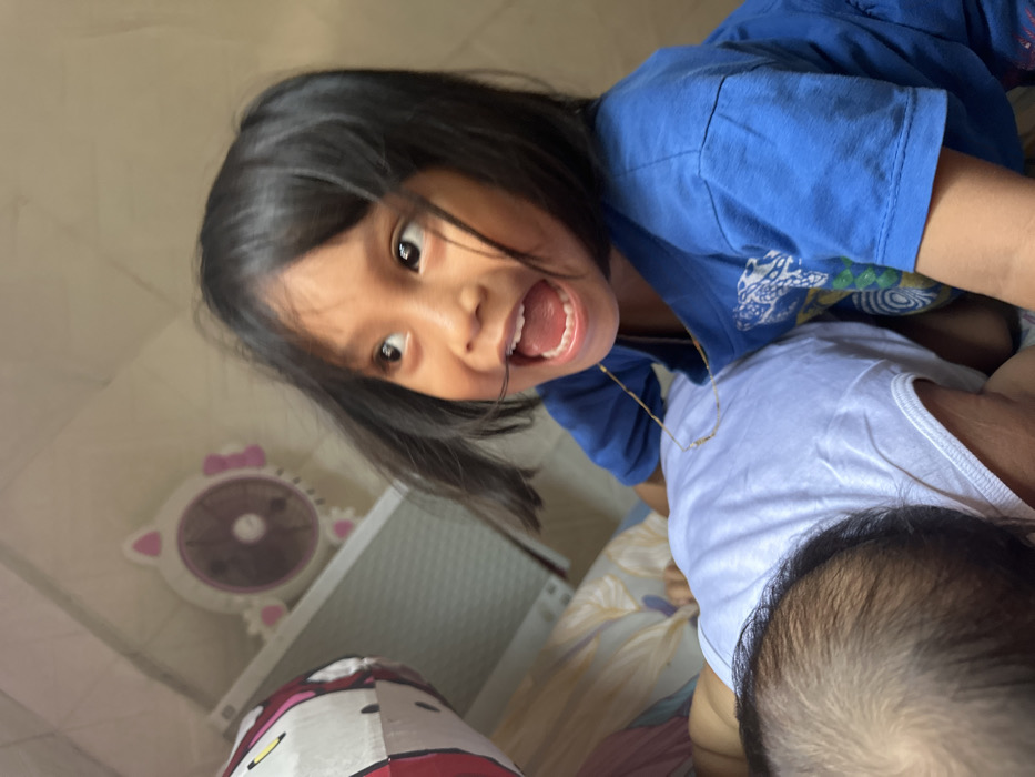 A young girl in a blue shirt smiles broadly at the camera, with her mouth open. A gold necklace hangs around her neck. She appears to be lying on top of someone wearing a white shirt, whose face is not visible. The background includes a Hello Kitty-themed fan on a white dresser, with a bed beneath. The photo seems to be taken from a slightly tilted, close-up angle.