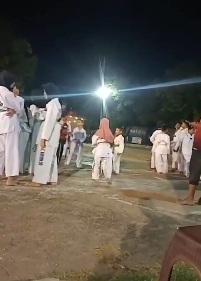 group of children in Taekwondo uniforms standing on a paved area at night. There is a street lamp providing light. Some adults are also present. The children are lined up and appear to be receiving instructions or preparing for an activity. In the background, there are food stalls with lights, suggesting a public space or event. The camera moves slightly, panning across the scene.