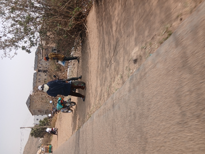 A slightly blurred outdoor shot shows several people standing on a dirt path adjacent to a paved road. Two are near motorcycles. One is wearing a white helmet and dark coat, while another wears a yellow-and-black shirt. In the background, buildings are visible, along with trees and other vegetation. Further down the road, more motorcycles and a three-wheeled vehicle are seen. The overall color palette is dominated by earth tones and muted colors.