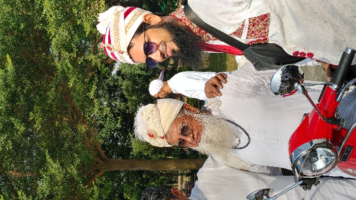 Two men, likely Muslim, are posing beside a red scooter. The first man wears a white and red turban, sunglasses, and a decorative robe. The second man, older, has a white beard, white turban, and white shirt. In the background, another man in a white Muslim cap stands behind them. Trees and greenery are visible.