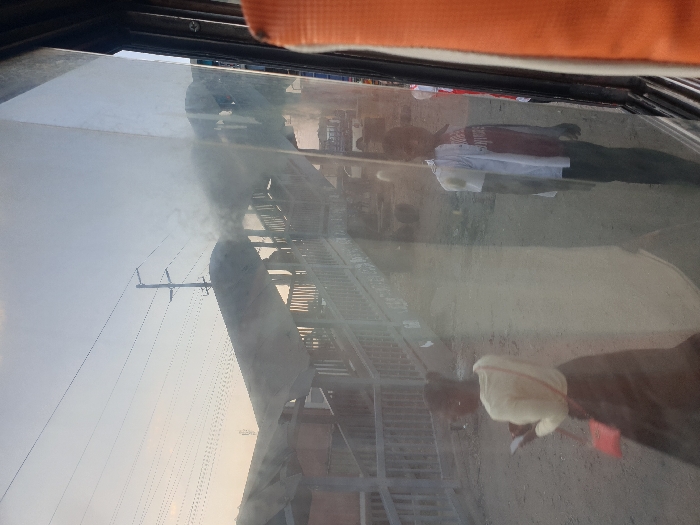 A street scene is reflected on a window. A power line and a fire escape are seen on the left. On the right, a person is seen wearing a white shirt with a red design on it. The person is walking on a sidewalk. The scene appears to be taken from inside a vehicle.