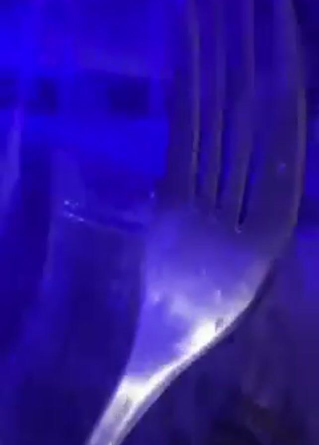 A metal fork is seen under blue lighting, likely inside a dishwasher