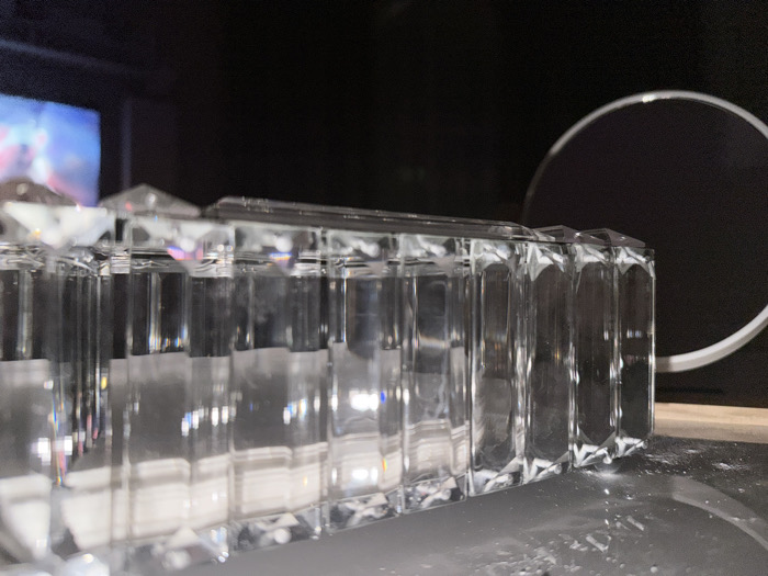 A rectangular crystal box sits on a glossy surface. The box's design features vertical, rectangular sections with angled edges. Light refracts through the crystal, creating bright highlights. A blurred image, possibly a TV screen, is visible on the left. A round, dark object with a white edge is on the right behind the box. The background is mostly dark.
