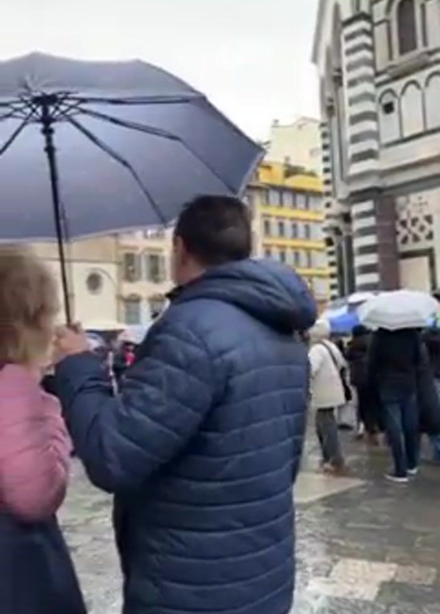 group of people standing outside of a building in the rain. Most people have umbrellas. The building has a distinctive black and white striped pattern on its exterior and what appears to be a statue above the entrance. There are other buildings in the background. The ground is wet from the rain. The people are standing in line. Many of the people are wearing jackets and backpacks.