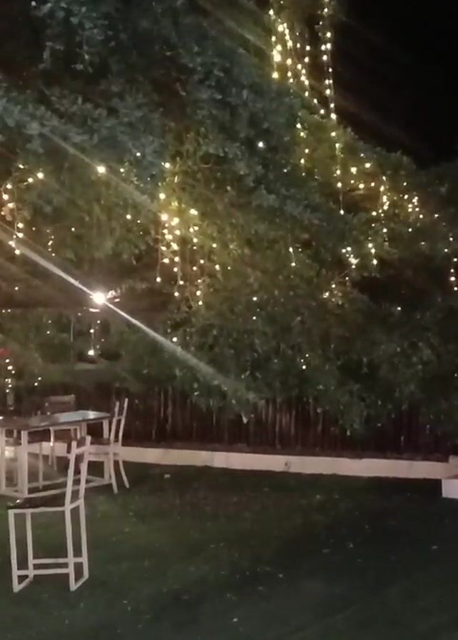 At night, a dimly lit outdoor space features tables and chairs on green turf. A large tree stands as a backdrop, adorned with strings of small, warm-toned lights. A fence runs behind the tree, and the area is generally dark. The space is possibly a garden or patio area for a restaurant or event.