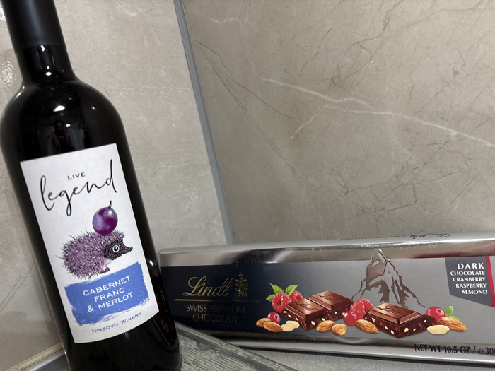 The image displays a dark glass bottle of red wine positioned next to a rectangular chocolate box, both resting on a light-colored, veined tile surface. The wine bottle presents a white label featuring the text "LIVE legend" in a script font, above an illustration of a purple hedgehog balancing a single purple grape. Below this, a blue rectangular field states "CABERNET FRANC & MERLOT" and "NISSOVO WINERY". A faint, blurred reflection of an individual is visible on the wine bottle's surface. Adjacent to the bottle lies a silver and dark gray Lindt Swiss Premium Chocolate box. The box's design includes an illustration of chocolate pieces, cranberries, raspberries, and almonds, with text indicating "DARK CHOCOLATE CRANBERRY RASPBERRY ALMOND" and a net weight of "10.5 OZ / e 300g". The background consists of a consistent light beige or grey tiled surface with dark, irregular, marble-like vein patterns. No human subjects are actively present or performing actions within the frame. While the wine is identified as being from Nissovo Winery, which is located in Ruse Province, Bulgaria, the specific location within the city of Ruse cannot be determined from the visual information provided in the image.