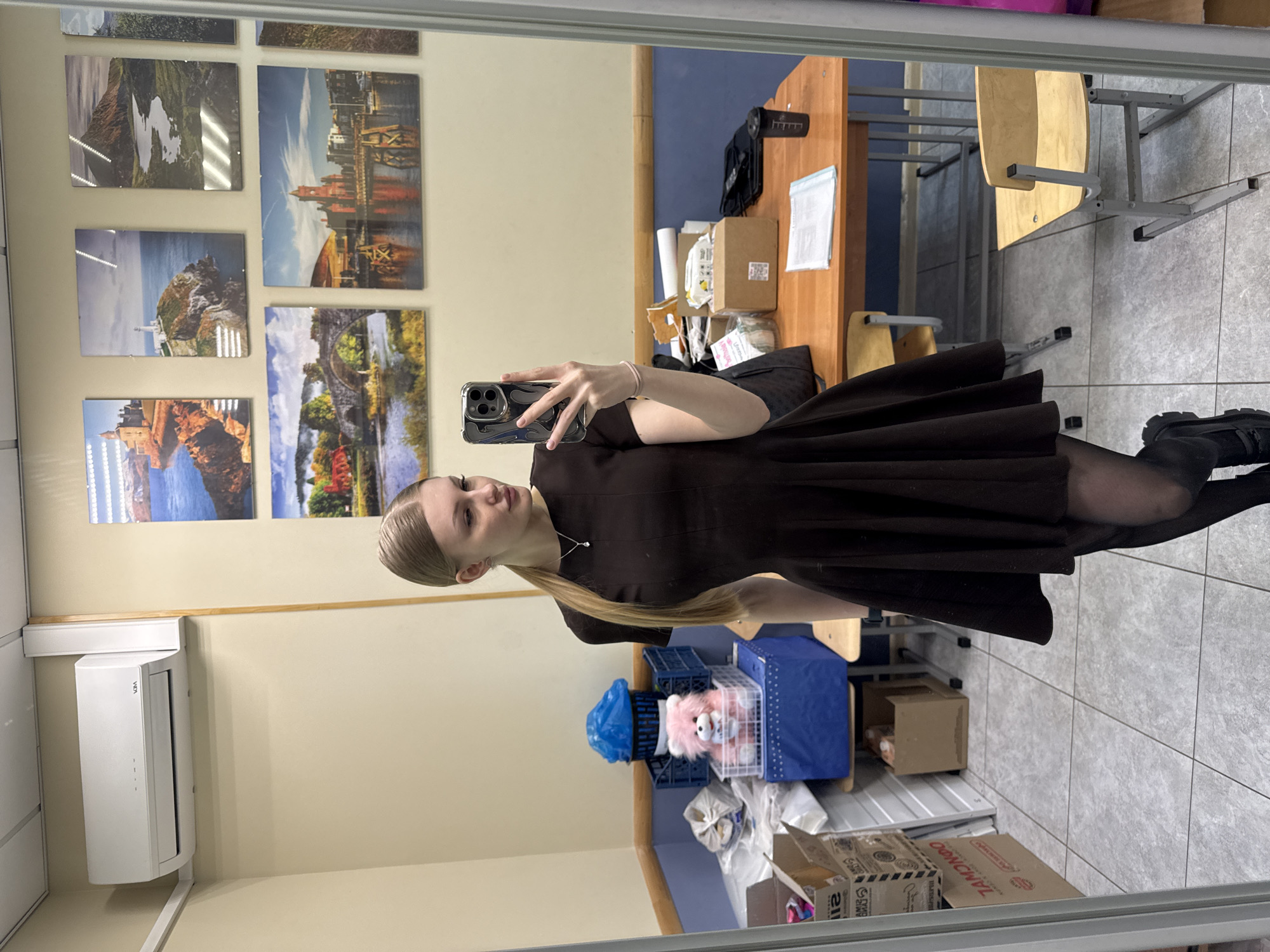 A young woman is taking a selfie in a mirror in a room that appears to be an office or classroom in Perm, Russia. The background includes wall-mounted landscape images, a desk with papers and other items, chairs, boxes, and an air conditioner. The woman is wearing a dark dress and tights. A blue plastic basket with what appears to be a teddy bear is visible as well.