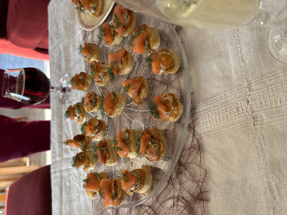 A circular transparent glass platter with an etched decorative pattern centrally displays approximately 25 small puff pastry vol-au-vents. Each vol-au-vent is filled with a creamy substance, topped with sliced smoked salmon, and garnished with a sprig of fresh dill. The platter rests on a light-colored woven tablecloth featuring a reddish-brown textured element on its left side. In the upper center-right, a stemmed goblet containing a dark amber liquid is visible. The lower right foreground shows a partially visible, out-of-focus champagne flute holding a pale yellow beverage. An out-of-focus individual wearing dark red trousers is partially visible in the upper left background, and a red upholstered furniture piece is in the distant upper right background. The scene captures a social gathering in an indoor setting within Souffelweyersheim, France.