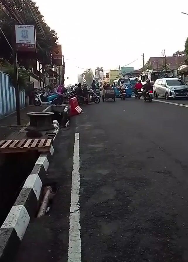 The camera pans across a busy street in what appears to be an urban or suburban area. The initial view shows a sidewalk with black and white striped curbing, a partially covered drainage ditch, and a pallet on the edge. The street is filled with traffic, including cars, vans, and motorcycles. There are people on the sidewalk and on the street. The camera pans to the right, following the flow of traffic and revealing more of the street, adjacent buildings, trees, and billboards. The overall atmosphere seems busy and crowded.