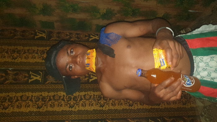 The image displays a young, shirtless male, possibly an adolescent, positioned indoors. He wears a black baseball cap backward and patterned shorts featuring green, red, and white stripes and a repetitive "GG" logo. A torn blue netting and a piece of black fabric are draped over his left shoulder. He holds a yellow rectangular wrapper, possibly from a snack item, horizontally between his teeth, obstructing his mouth. His eyes are open and directed at the viewer. In his left hand, he holds a Fanta Orange bottle. In his right hand, he holds two small yellow packaged items, likely snacks. A white wristband is visible on his right wrist. The background is a dark wall covering with ornate golden patterns, including prominent "LV" (Louis Vuitton) logos. The scene is located in Obosi, Nigeria.
