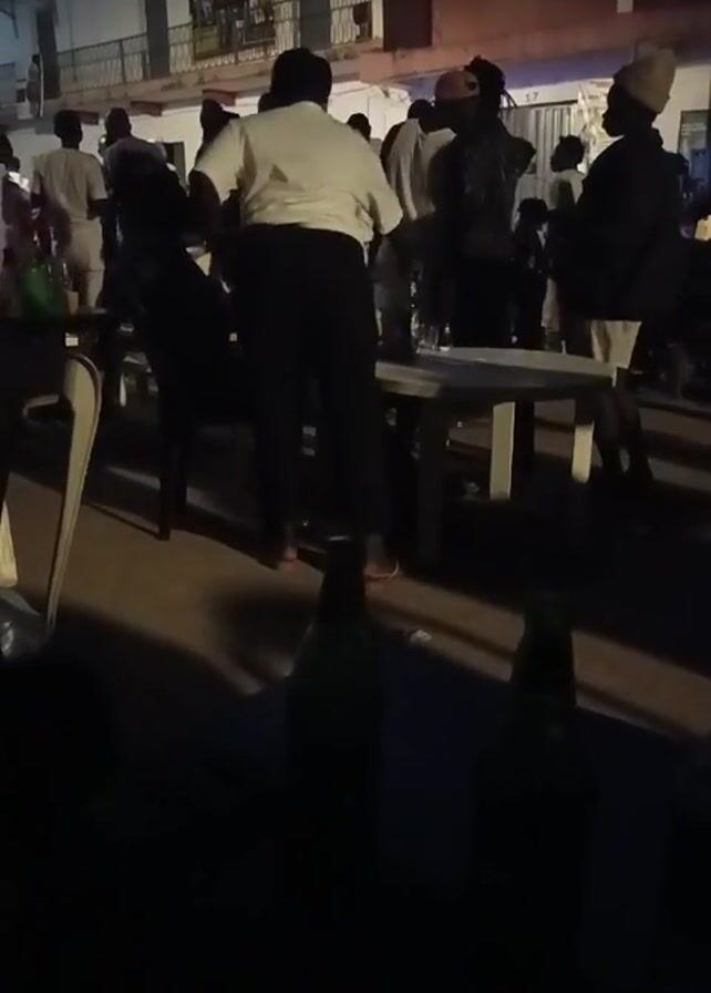 dimly lit outdoor gathering at night. Several people stand around tables and chairs. Some people are wearing light-colored clothing, while others are in darker outfits. One person in a white shirt and dark pants is in the center of the frame with their back to the camera. There are green beer bottles visible in the foreground. A building with a sign reading "ABC STUDIOZ" is visible in the background. The overall atmosphere suggests a casual social event or bar setting.