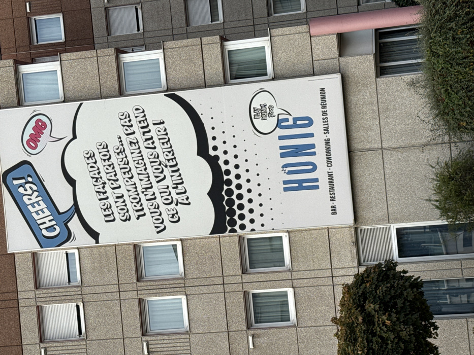 The image displays a multi-story building facade in Schiltigheim, France, captured from an upward angle. A prominent, large vertical banner in a comic-book art style covers a significant portion of the building's central section, spanning multiple floors. The banner features a blue speech bubble with "CHEERS!" and a smaller pink bubble with "OMG" at its top. Below these is a large white speech bubble containing the black text: "LES FAÇADES SONT PARFOIS TROMPEUSES... VOUS N'IMAGINEZ PAS CE QUI VOUS ATTEND À L'INTÉRIEUR!" The lower part of the banner shows a black halftone dot pattern, followed by the brand name "HONIG" in large blue letters. Below "HONIG," the services "BAR - RESTAURANT - COWORKING - SALLES DE RÉUNION" are listed in black text. A small white speech bubble near "HONIG" contains "PLAY DRINK FOOD." The building's visible facade consists of light gray rectangular panels, delineating a grid pattern. Numerous rectangular windows with white frames are present; some show light-colored curtains, while others are equipped with external roller shutters, some partially or fully closed. A vertical pink pipe or column is visible on the lower right side of the building. Green foliage, including a dense bush or small tree, is present in the lower left foreground, and additional shrubbery lines the building's base on the right. No individuals are depicted in the scene.