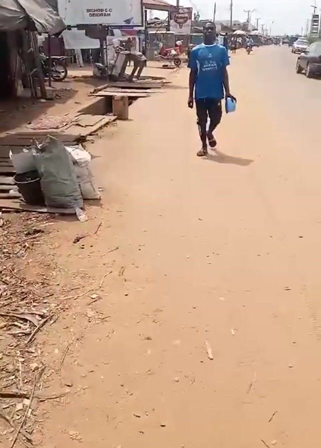 dusty roadside scene in what appears to be a developing country. A young boy with a tray of goods balanced on his head is the main subject. He is wearing a blue tank top, a dark skirt or shorts, and sandals. He walks along the roadside, past a dirt area with bags and various debris. A man in a blue shirt and dark shorts walks on the same side of the road in the opposite direction. Further along the road, there are cars, motorcycles, and other people. The backdrop includes shops or stalls with makeshift awnings and signage. A billboard with an image of a man and text is visible in the background, mentioning "Life of Faith Gospel Assembly." The road is unpaved and dusty. The camera perspective changes slightly as the boy moves, but mostly remains focused on him and the immediate surroundings.