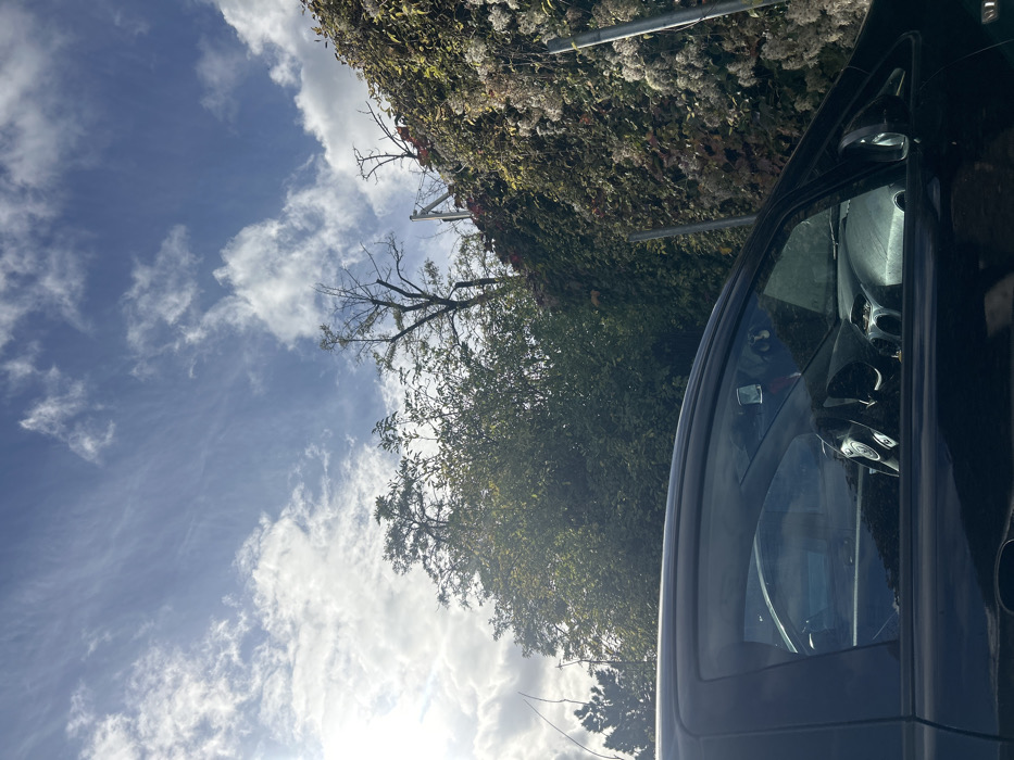 The scene is an exterior view in Pantin, France, captured during daylight under a partially cloudy sky. The lower half of the frame is dominated by a dark-colored compact vehicle, angled toward the right. Visible elements of the vehicle include the driver's side window, part of the passenger's side window, the steering wheel, dashboard, and a rearview mirror in its interior. No individuals are present inside the vehicle or elsewhere in the visible frame. Behind the vehicle and extending to the right, a wall is densely covered with vegetation, comprising green foliage, sections of reddish leaves, and numerous white, fluffy seed clusters. Two metallic vertical posts are partially visible against this vegetated surface. To the left and behind the vehicle, a dense grouping of trees with green leaves is present, with several taller, largely denuded trees interspersed. The upper portion of the image shows a blue sky with scattered white clouds, including both wispy and cumulus formations. A bright sun glare emanates from the upper left quadrant.