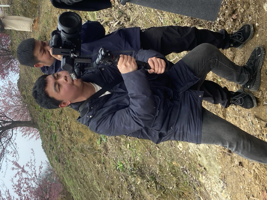 Two men operate a camera rig outdoors, likely for filming. One man holds the camera and stabilizer, wearing a dark jacket and gray jeans, while the other lies behind him, supporting the setup. Both wear dark shoes. The setting appears to be a natural environment with flowering trees, suggesting a rural or park location.