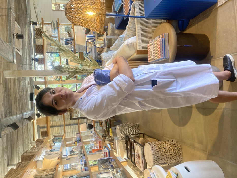 A woman in a white shirt dress and black sneakers stands in a shop filled with home goods and decor. She has short dark hair and is holding a blue striped towel in her arms. Shelves display various items including woven baskets, books, and decorative objects. A rattan lampshade hangs overhead. The shop has a warm, natural aesthetic with a concrete floor.