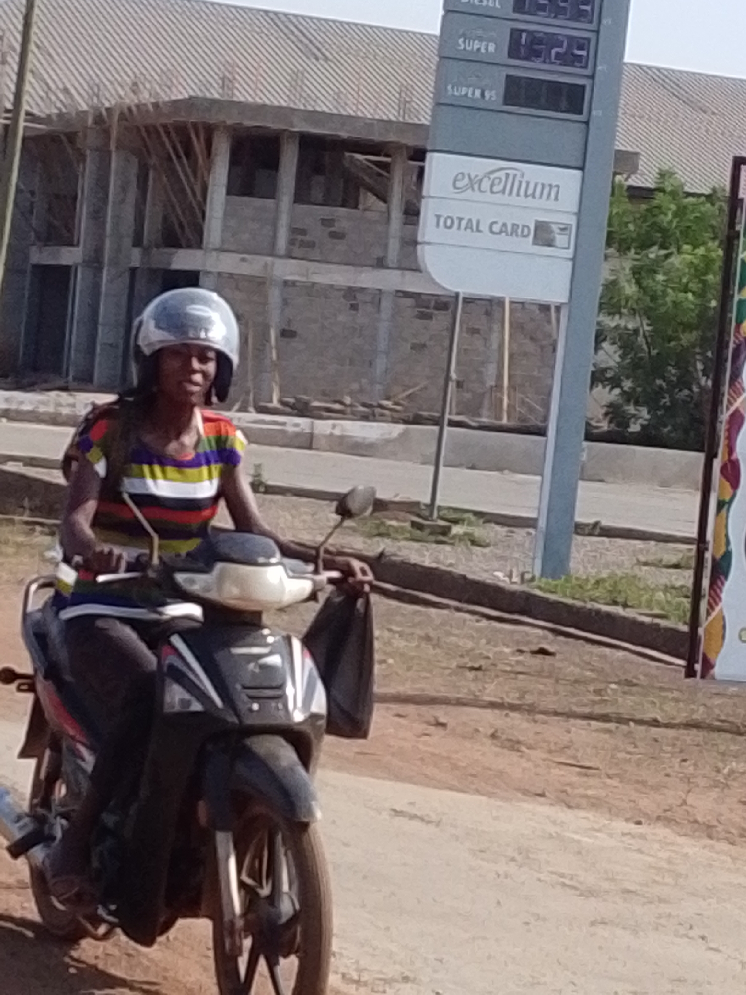 A young adult female is depicted operating a black, grey, and white scooter-style motorcycle on an unpaved road in Dungu, Ghana. She wears a light-colored full-face helmet and a short-sleeved, horizontally striped shirt featuring red, orange, yellow, green, blue, and white bands, along with dark trousers. Her hands are positioned on the motorcycle's handlebars. In the background, a tall, grey fuel station sign for "excellium" is visible, displaying fuel prices for Diesel at 15.93 and Super at 13.29, with "TOTAL CARD" below. Behind the fuel sign and to its left, an unfinished multi-story building constructed with concrete blocks and exposed wooden roof trusses is present. Green foliage is visible behind the sign on the right side of the frame. The immediate foreground consists of a light brown dirt road; a concrete curb and paved surface are situated further back from the road. A partial view of a colorful patterned banner is visible on the far right edge of the image.