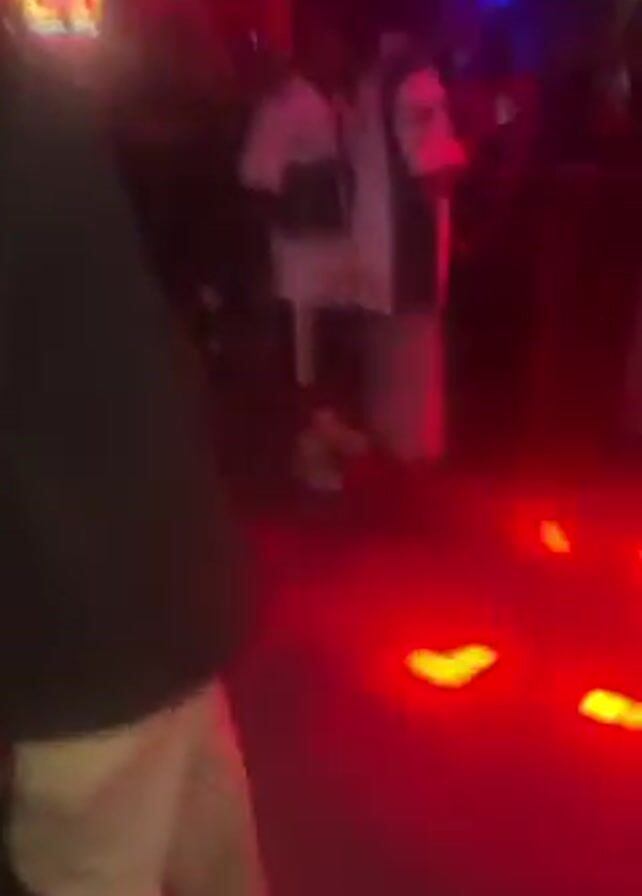 crowded, dimly lit indoor space with colored lights. Several individuals are visible, including one wearing a black shirt who appears to be moving and another in a white shirt with what seems to be a bag over their shoulder. The lighting consists of red, green, purple, and blue hues. The exact activity is unclear due to the camera's movement and lack of focus.