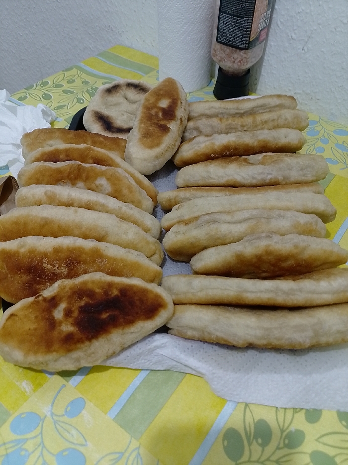 - "In an indoor setting in Unknown, Unknown, a close-up overhead view displays a collection of freshly prepared dough items resting on white paper towels, which in turn are placed on a dark tray" by FM-5n8Vg2, licensed under CC BY 4.0