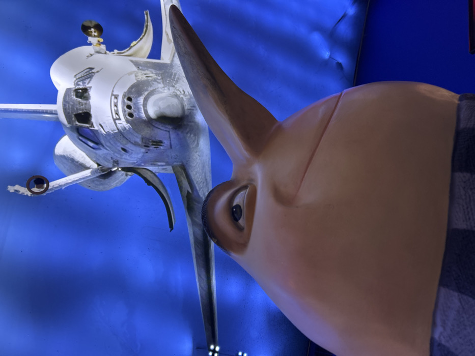 The image captures an indoor scene from a low-angle perspective, located in Ramat HaSharon, Israel. A large, light-tan colored statue or inflatable representing the animated character Gru occupies the foreground, featuring a prominent, upward-angled nose, dark eyes gazing upwards and to the right, and a subtle smile line on the left side of its face. A blue and white checkered pattern is visible at the bottom edge of the figure, indicating part of its attire. In the mid-ground, a detailed model of a Space Shuttle is suspended against a vibrant, deep blue backdrop. The white and gray shuttle model displays its cockpit, nose cone, and extended wings, with visible surface detailing and dark cockpit windows. Artificial multi-point light sources are discernible on the far left of the blue background. The composition positions the Gru figure as if observing the overhead Space Shuttle model.