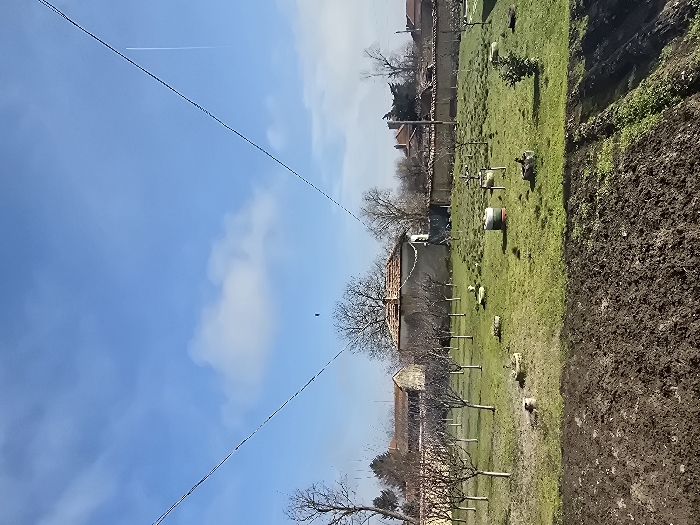 The scene depicts an outdoor landscape in Byala Cherkva, Bulgaria, under a predominantly clear blue sky with scattered white cumulus clouds and a faint vertical aircraft contrail visible in the upper right quadrant. Two parallel overhead utility wires diagonally cross the upper portion of the frame, converging towards the top center. The immediate foreground consists of a large expanse of dark brown, freshly tilled earth, with isolated green sprouts visible along its right edge. The midground is a vibrant green grassy area containing numerous uniformly spaced, bare deciduous trees, arranged in rows, suggesting an orchard or garden plot. Situated on the grass are several grey concrete rings, a cylindrical red and white striped barrel, and a small, dense green evergreen bush on the right. Two dark-feathered fowl, appearing to be ducks or geese, are resting on the grass; one is located in the center-left, and another further right, near the barrel. The background features a cluster of traditional buildings with red-tiled roofs, separated from the grassy area by a low, light-colored stone or concrete wall. Beyond these structures, a dense line of bare deciduous trees stretches across the horizon. A small, dark blue rectangular object is observed hanging from a tree branch slightly to the left of the central background house.