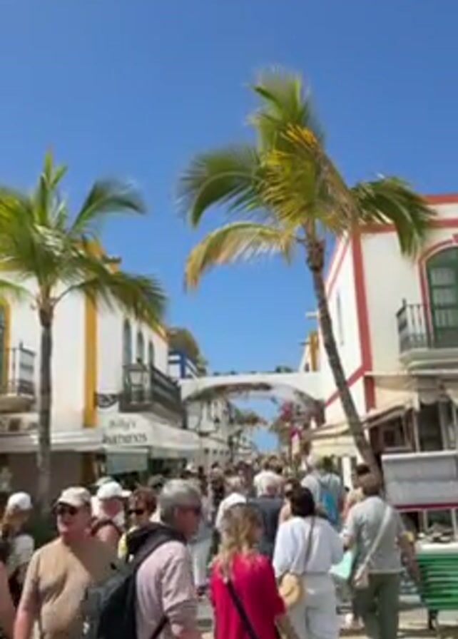 crowded street lined with white buildings adorned with orange and red trim under a clear blue sky. Palm trees dot the scene. Many people are walking along the street in both directions. One building has a sign reading "Billy's Apartments."