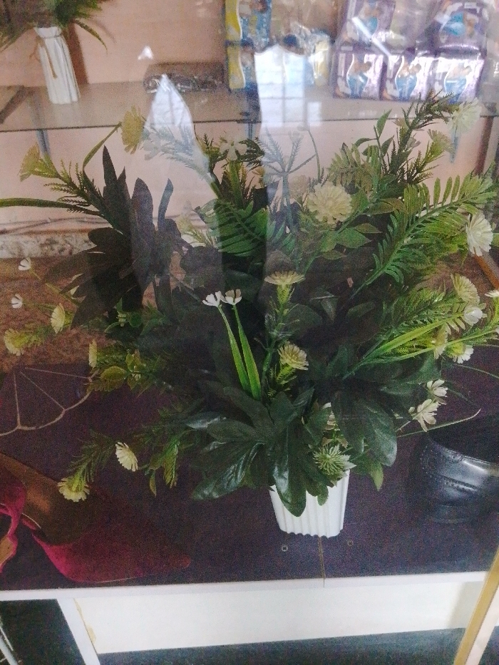 The scene is an indoor retail display in Bukuru, Nigeria, captured through a glass barrier. A white fluted vase, centrally located, holds an arrangement of artificial green foliage and numerous small, pale yellow and white artificial flowers. This arrangement rests on a dark, reflective shelf. To the left of the vase, a burgundy high-heeled shoe with an open toe is visible. To the right, a dark men's dress shoe with brogue detailing is present. In the background, behind the main display and visible through the glass, are several packaged consumer goods, including items in blue and purple wrapping, arranged on an upper shelf. Reflections are visible on both the glass barrier and the dark display surface. No individuals or actions are depicted.
