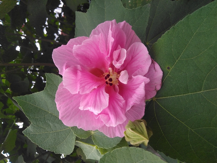 A close-up, vertical shot captures a large, fully bloomed pink double-petaled flower, likely a Hibiscus, centrally positioned amidst dense green foliage in Cimacan, Indonesia. The flower exhibits multiple layers of ruffled petals, with a darker pink and visible stamens at its core. Surrounding the prominent bloom are several broad, green, multi-lobed leaves, some displaying minor dark spots or imperfections. To the immediate left and slightly below the main flower, a light green, unopened flower bud is visible. The background consists of blurred, dark green vegetation, indicating an outdoor, natural environment. No people, objects other than flora, actions, or interactions are present in the scene. The lighting suggests natural daylight.