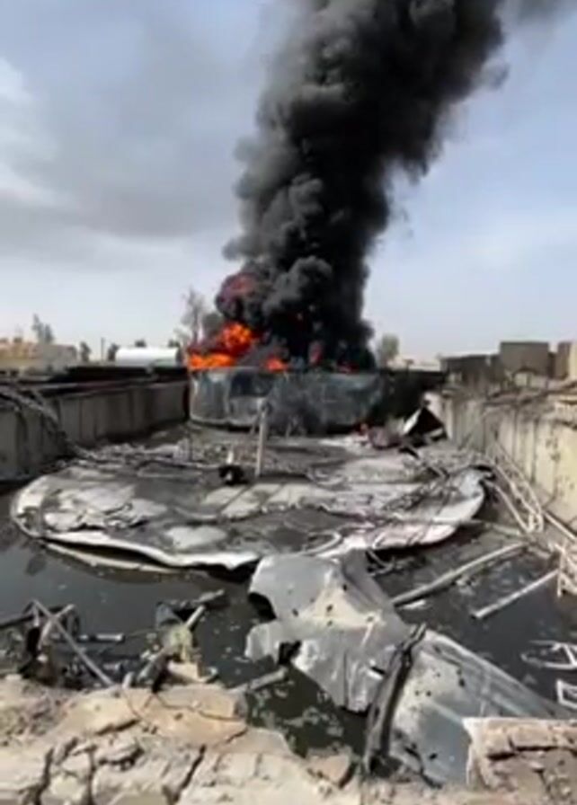 large fire burning in what appears to be an industrial or storage facility. Thick black smoke billows upwards, obscuring the sky. The fire is centered on a circular structure, surrounded by debris and water. The surrounding area is also damaged, with crumbling brick walls and scattered metal fragments. There are no people visible in the video.