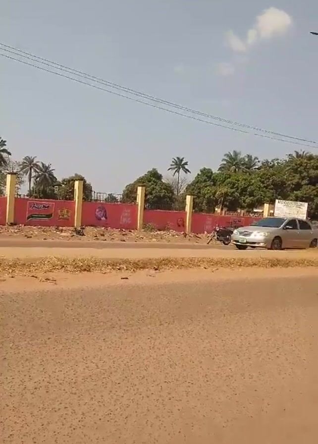 The video depicts a street scene in what appears to be a town in Africa. The road is paved and is flanked by a low wall painted red with yellow columns. Trees, including palm trees, are visible beyond the wall. A silver sedan drives past. Several people are walking on the sidewalk or crossing the street. Motorcyclists are also seen riding on the road. A sign for Kogi State Polytechnic Anyigba and another sign for Our Lady of Schools Anyigba are visible on the wall. The sky is blue with a few scattered clouds. The overall environment is warm and bright. The video appears to have been taken by someone holding a camera while standing on or near the side of the road.