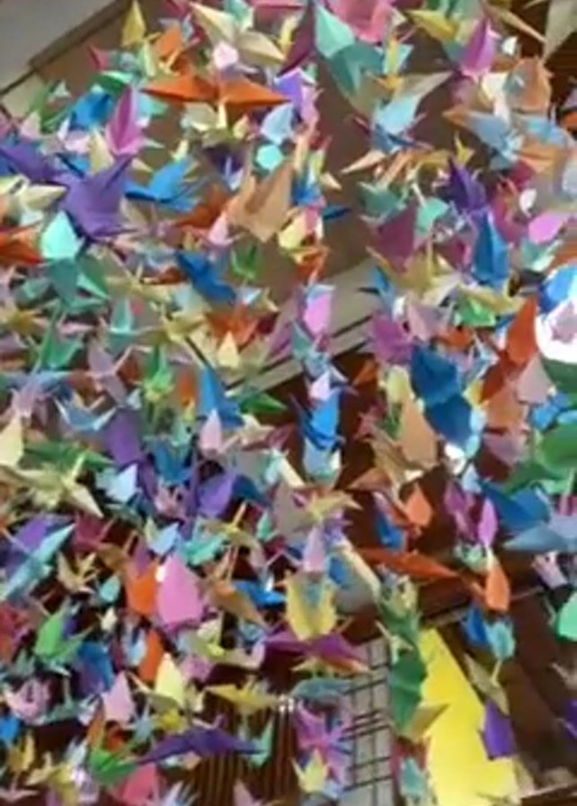 room decorated with numerous colorful origami cranes hanging from the ceiling