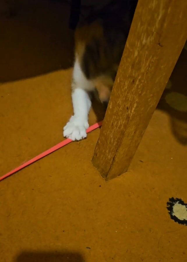 - "A cat, mostly out of frame and partially obscured by a wooden table leg, interacts with a thin, pink string on a brown carpet" by FM-TZLGv2, licensed under CC BY 4.0