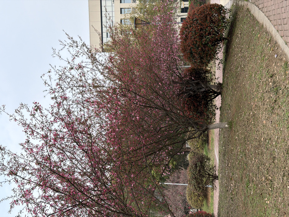 The scene depicts a landscaped outdoor environment, consistent with a park or campus setting, under an overcast sky. Multiple deciduous trees in the foreground and midground exhibit extensive small pink blossoms on their branches, indicative of spring bloom. The ground cover consists of sparse, dry green grass mixed with brown leaf litter. Several low, rounded bushes with both green and reddish-brown foliage are arranged in the midground. A light-colored tree trunk is visible centrally in the foreground. A curving red brick pathway borders the right side of the scene, receding into the background. In the upper right background, a modern, multi-story building with a light-colored facade and dark-framed rectangular windows is partially visible. A dark-colored street lamp with a conical shade is positioned near the building and trees. No individuals or overt actions are present. The scene is located in Jiangning District, China.