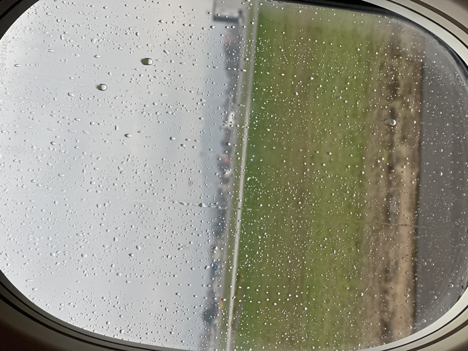 The image displays an exterior view captured from inside an aircraft through a circular porthole window. The window glass is covered with numerous, distinct raindrops of varying sizes, indicating active precipitation. Portions of the cream-colored window frame are visible on the left and bottom right. Beyond the rain-streaked glass, an airport ground environment unfolds under an overcast, grey sky. A large expanse of vibrant green grass occupies the midground, transitioning to a dark grey asphalt surface, consistent with a taxiway or runway, in the lower foreground. In the distant background, blurred white forms suggestive of parked aircraft and indistinct airport infrastructure, including building structures, are discernible. The depicted scene is an airfield located in Orio al Serio, Italy.