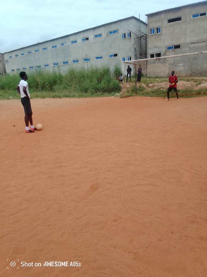 The scene depicts an outdoor football ground in Egbagu, Nigeria, under an overcast sky