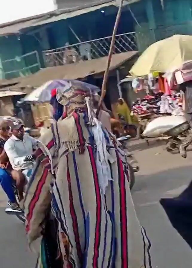 man in a traditional, striped costume, with a pole, walking along a street in a crowded, outdoor market. He is surrounded by people in everyday clothing and traditional coverings, including hijabs and patterned dresses. The market area has small buildings, stalls, and cars nearby.