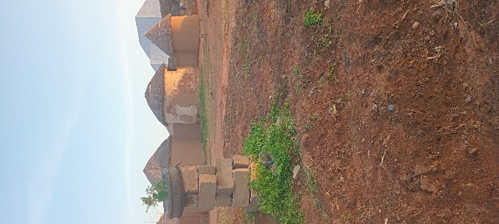 A rural scene shows a row of traditional, round, mud-walled huts with thatched roofs. To the left are stacked, rectangular blocks. The ground is red soil sparsely covered with vegetation. A building with a modern metallic roof stands behind the huts, contrasting with the older architecture. The sky is pale blue.