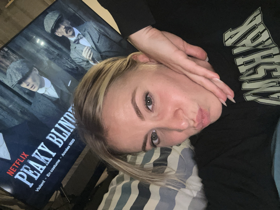 A woman lies on a striped pillow, looking at the camera with slightly puckered lips. Her blonde hair is partially visible. Her hand is positioned near her face. Behind her, a television displays a scene from the Netflix show "Peaky Blinders", featuring two male characters in period attire and the show's title. The screen also displays a "Violent" rating and the time period "Années 1920". She wears a dark top with faded text.