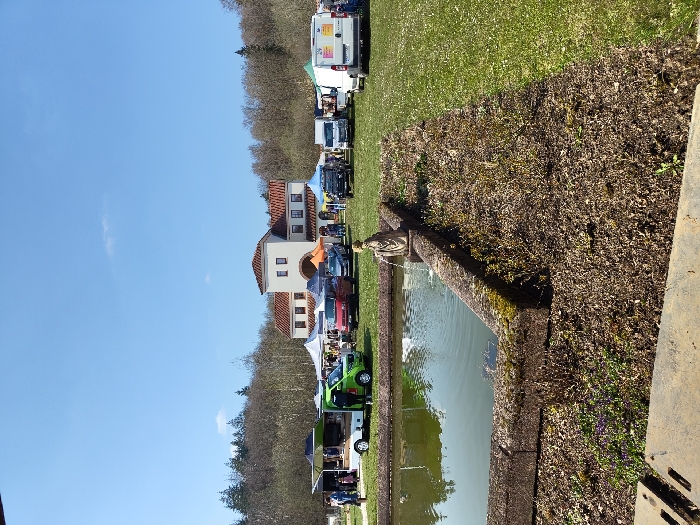 The image depicts an outdoor market or event occurring under a clear blue sky in Perl, Germany. In the immediate foreground, a rectangular pond with stone edges, covered in moss, contains greenish water. A light-colored statue of a robed figure serves as a fountain, with water flowing from a jug into the pond. Surrounding the pond are patches of dry earth with minimal vegetation and sparse small purple flowers, transitioning to green grass. In the midground, a collection of vendor stalls are set up, characterized by various tents, predominantly white, with some colored options. Numerous vehicles are parked, including a green food truck-style van, several white vans, a red van, and a dark SUV-type vehicle. Multiple individuals are observed standing and walking between the tents and vehicles, indicative of an active gathering. The central feature in the mid-background is a two-story building constructed of light-colored material, featuring a reddish-brown tiled roof and a distinctive central section with two windows and an arched recess. The background consists of a dense treeline, primarily composed of bare deciduous trees, situated beneath a uniformly blue sky.