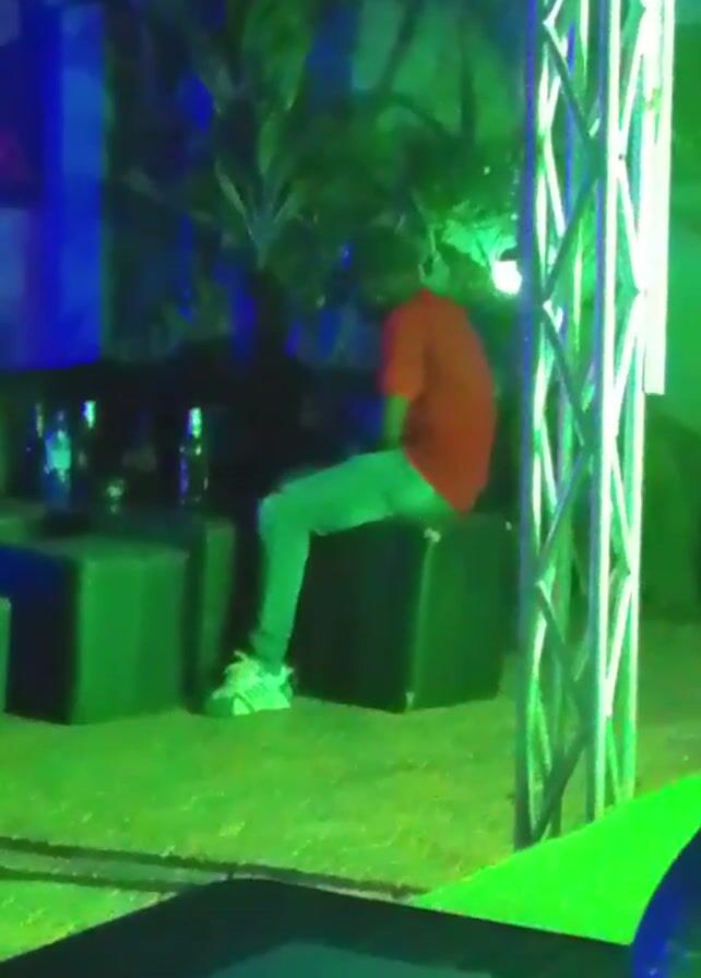 person sitting on a dark-colored cube-shaped seat in an outdoor setting. The person is wearing a red shirt, light-colored jeans, and white sneakers. In the background, there's a dark sofa, a low table with bottles, and some greenery. To the right, there's a metal structure. The area is illuminated with blue and green lighting. The camera is positioned at a low angle, showing the scene from a slightly obscured viewpoint. The person is sitting still, appearing to be either resting or waiting.