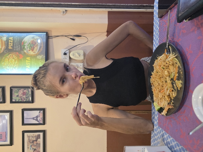 A female individual is seated at a restaurant table in Ao Nang, Thailand, actively consuming a meal