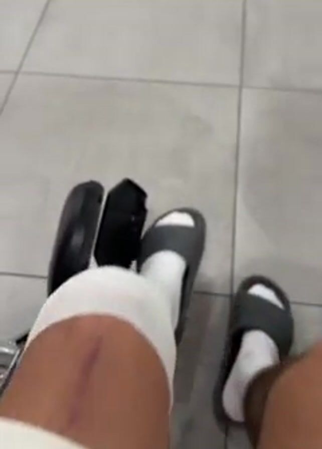 person sitting in a wheelchair, wearing white shorts, a sock on their left foot, and gray slides. The left knee is bandaged and has a visible scar. The wheelchair is moving through a hallway with gray tiled floors and white walls. In the distance, medical personnel are visible pushing a person in another wheelchair. The scene appears to be inside a hospital or medical facility.