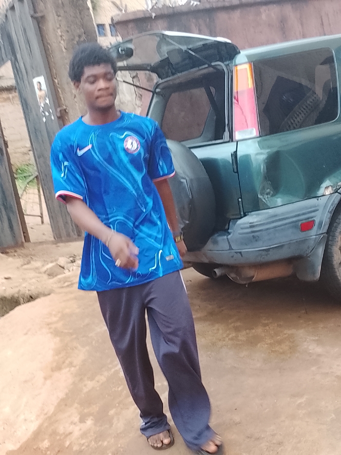 This image captures an outdoor scene in Awada, Nigeria, featuring a young adult male and a parked vehicle on an unpaved surface
