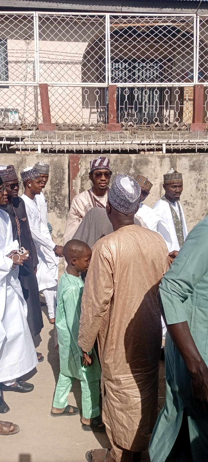 An outdoor daylight scene in Kaura Goje, Nigeria, depicts a group of approximately ten individuals, predominantly adult males, and one young boy, congregated on an unpaved, light brown surface